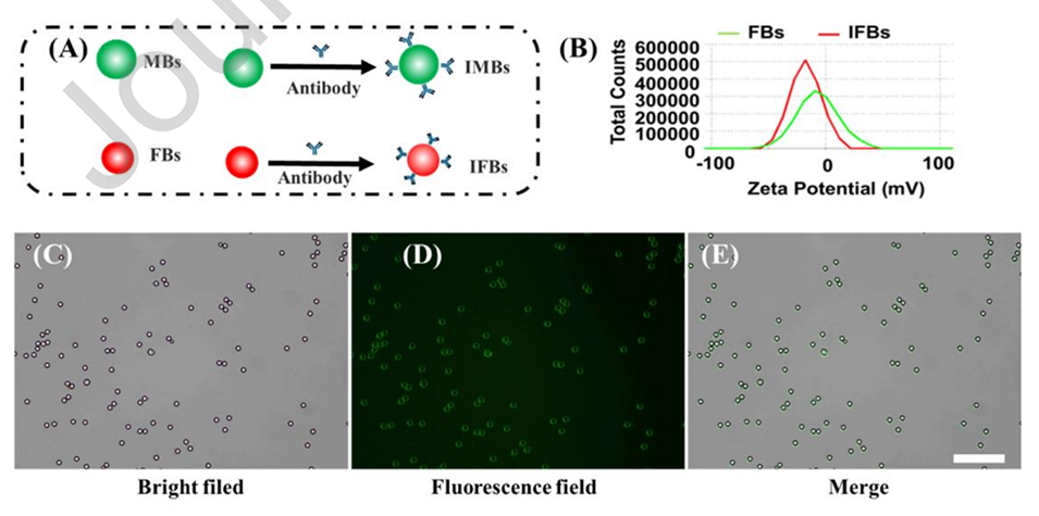 图1.(A)IMBs和IFBs生成原理。(B)FBs和IFBs的Zeta电位表征。(C-E)IMBs的显微镜图像。比例尺为100μm。