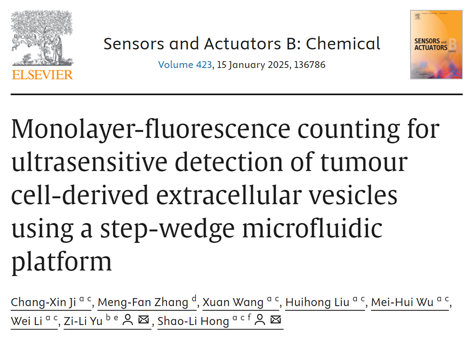 近期,武汉纺织大学洪少力团队与武汉大学口腔医院余自力团队合作,开发了一种基于微流控平台的单层荧光计数策略,用于超灵敏检测肿瘤细胞来源的细胞外囊泡,通过免疫磁性微球捕获和分离囊泡,并利用新设计的阶梯楔形微流控结构实现高效计数,显著提高了检测灵敏度和特异性,适用于早期癌症诊断。相关研究以“Monolayer-Fluorescence Counting for Ultrasensitive Detection of Tumour Cell-Derived Extracellular Vesicles Using a Step-wedge Microfluidic Platform”为题目,发表在期刊《Sensors and Actuators B: Chemical》上。