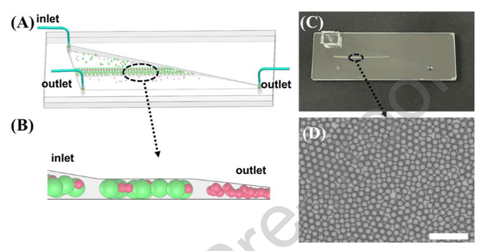 图3.(A)阶梯楔形微流体设计示意图。(B)单层微珠的示意图。(C)阶梯楔形微流控芯片的显微镜照片。(D)单层微珠的显微镜照片。比例尺为25μm。