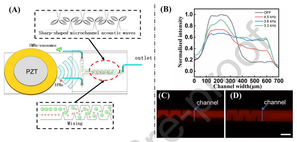 图2.(A)声波产生和混合原理。(B)不同频率条件下的荧光强度。(C-D)OFF/ON切换前微通道的荧光图像。比例尺为500μm。