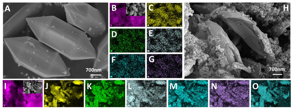 图1.(A)Zn/Co-ZIFs@MIL-101(Fe)的SEM图像和(B-G)EDS图像;(H)Zn/Co-ZIFs@MIL-101(Fe)与GLY孵育后的SEM图像和(I-O)EDS图像。