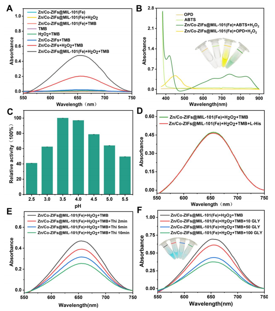 图3.(A)Zn/Co-ZIFs和Zn/Co-ZIFs@MIL-101(Fe)在NaAc-HAc缓冲液、TMB、H2O2和H2O2+TMB+NaAc-Hc缓冲体系中的紫外-可见光谱;(B)H2O2存在下,Zn/Co-ZIFs@MIL-101(Fe)在20mM ABTS和OPD溶液中的紫外-可见吸收光谱,以及仅ABTS和OPND溶液的光谱;(C)在L-His存在或不存在的情况下进行1O2验证试验;(D)硫脲存在或不存在时的·OH验证分析。