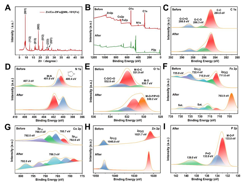 图2.(A)Zn/Co-ZIFs@MIL-101(Fe)与GLY孵育前后的XRD图谱和(B)XPS全扫描光谱,以及(C)C1s、(D)N1s、(E)O1s、(F)Fe2p、(G)Co2p、(H)Zn2p和(I)P2p的高分辨率光谱。