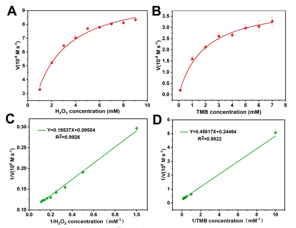 图4.Zn/Co-ZIFs@MIL-101(Fe)对H2O2(A)和TMB(B)的稳态动力学曲线;H2O2(C)和TMB(D)的相应双倒数图。