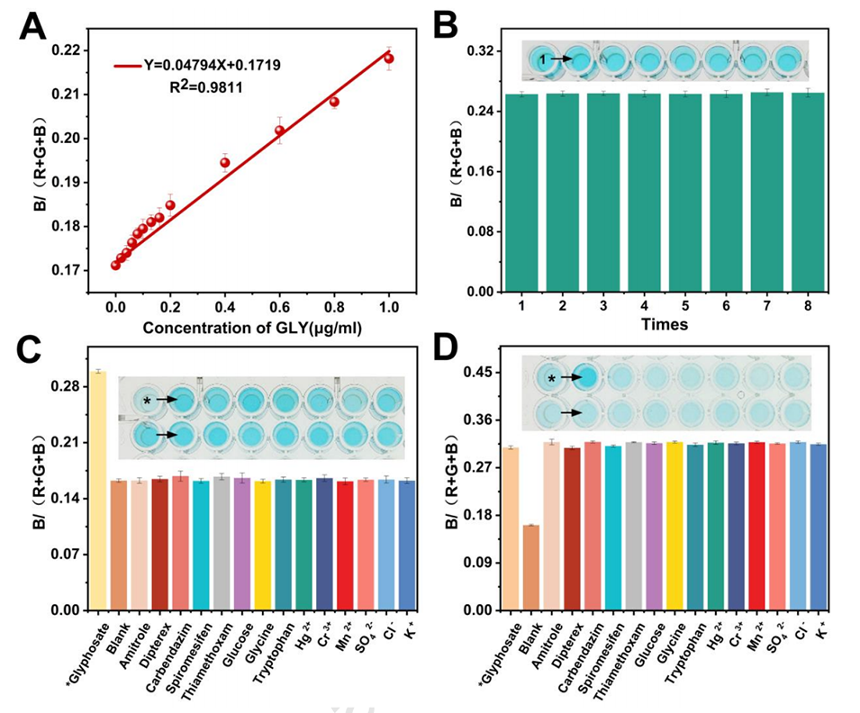 图6.(A)B/(R+G+B)与GLY浓度之间的线性关系;(B)基于Zn/Co-ZIFs@MIL-101(Fe)的智能手机检测技术的再现性;(C)存在GLY等干扰时的直方图和相应溶液颜色变化;(D)GLY与其他干扰共存时的直方图及对应的溶液颜色变化。