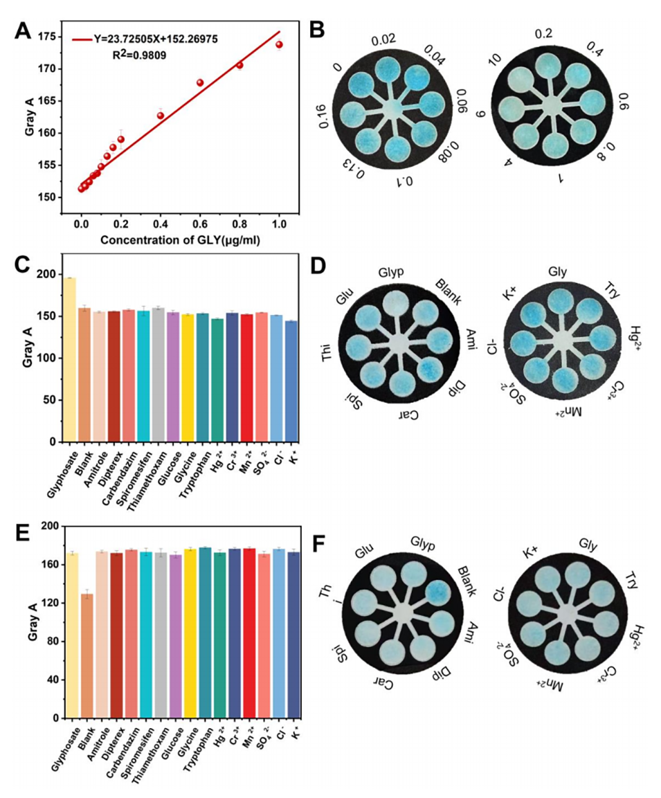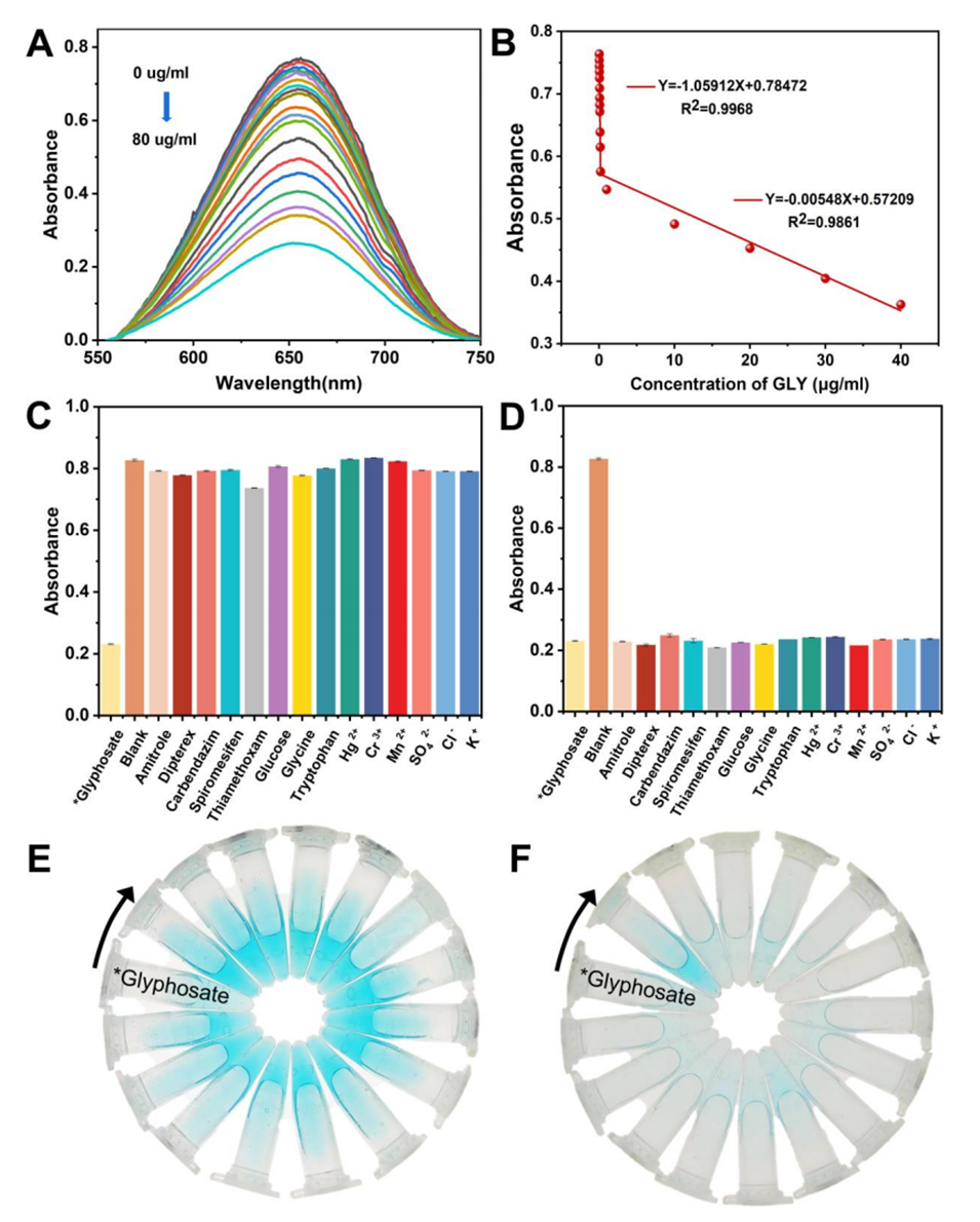 图5.不同浓度的GLY存在下,比色模式Zn/Co-ZIFs@MIL-101(Fe)+H2O2+TMB传感系统的紫外-可见吸收光谱(A)和相应的线性拟合曲线(B);(C)存在GLY等干扰时的直方图和(E)相应的溶液颜色变化;(D)GLY与其他干扰共存时的直方图及(F)对应的溶液颜色变化。
