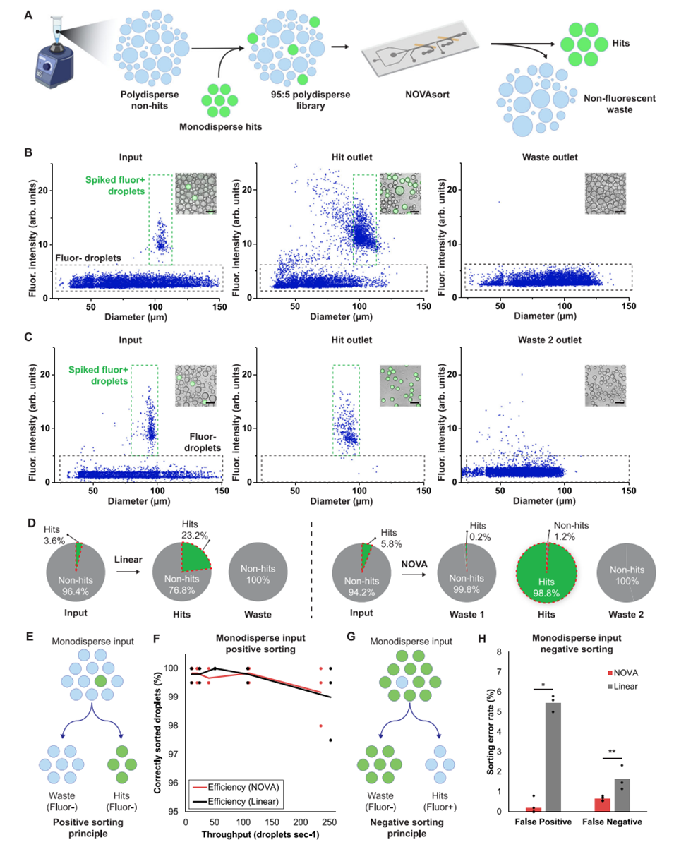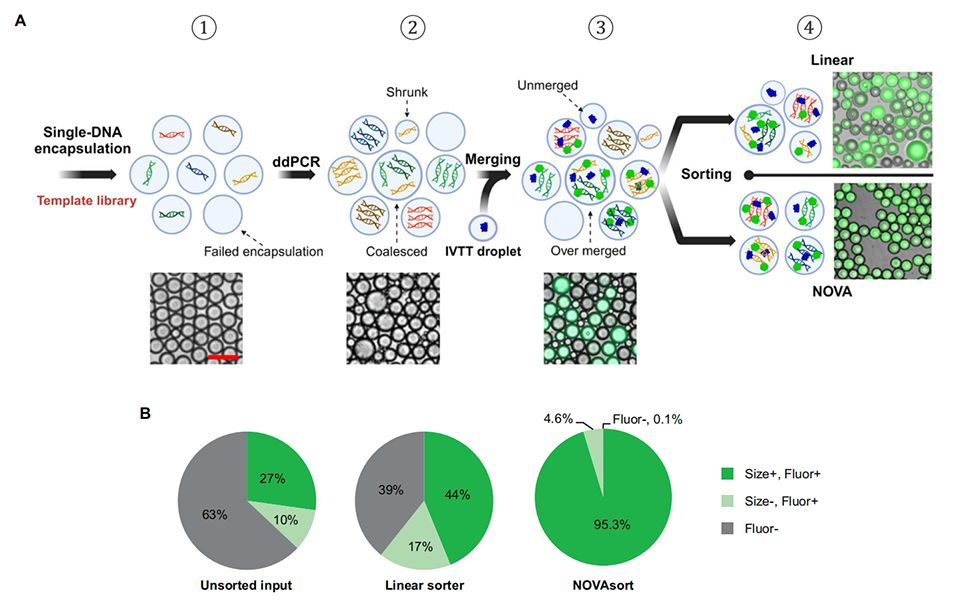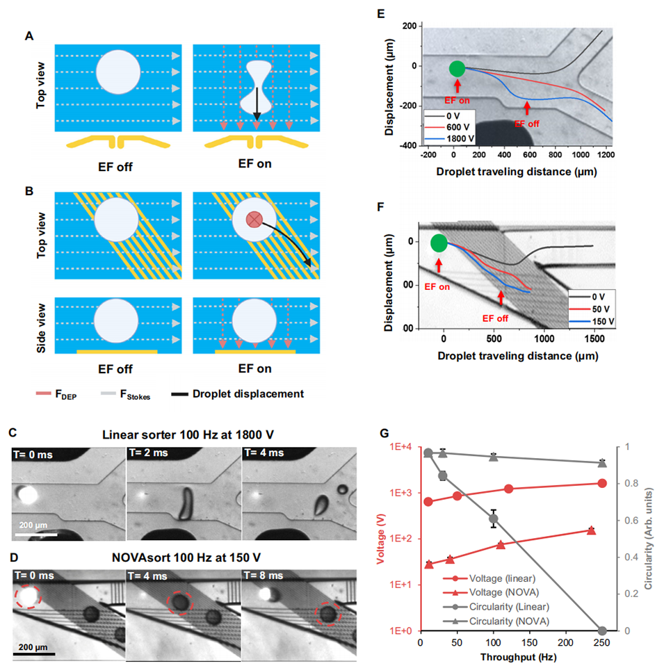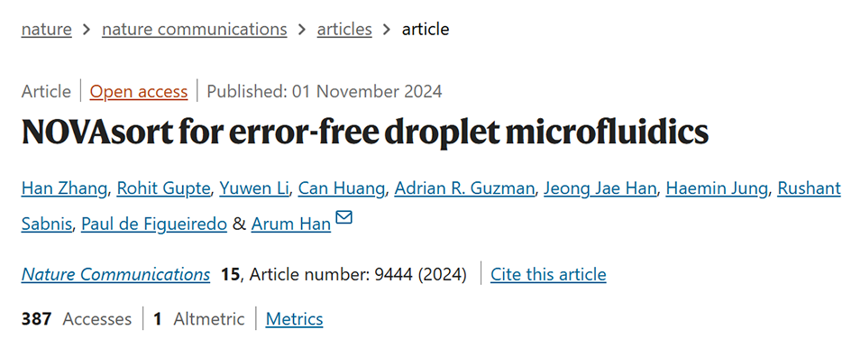 近期,美国得克萨斯A&M大学Arum Han教授课题组开发了一种名为NOVAsort(Next-generation Opto-Volume-based Accurate droplet sorter)的新型液滴微流控分选设备,能够基于液滴尺寸和荧光强度实现高精度分选,显著提高了单细胞分辨率及超高通量筛选的准确性和效率。相关研究以“NOVAsort for error-free droplet microfluidics”为题目发表于期刊《Nature Communications》。