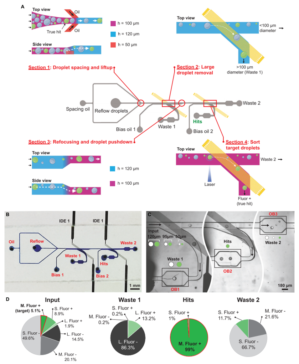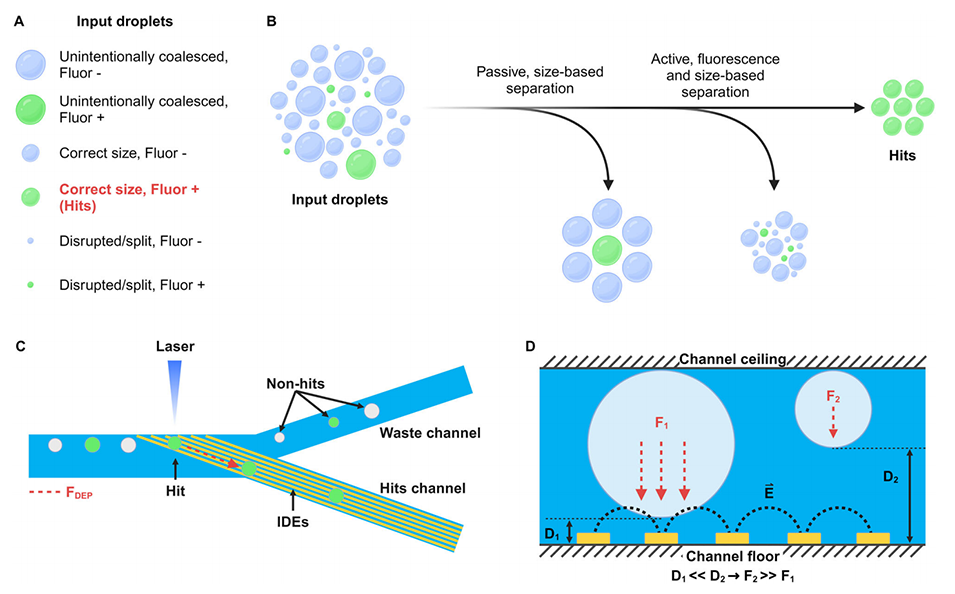 图1.NOVAsort液滴分选机的工作原理,该分选机使用平面IDE产生的DEP力和液滴浮力,同时进行基于尺寸和荧光的液滴分选。