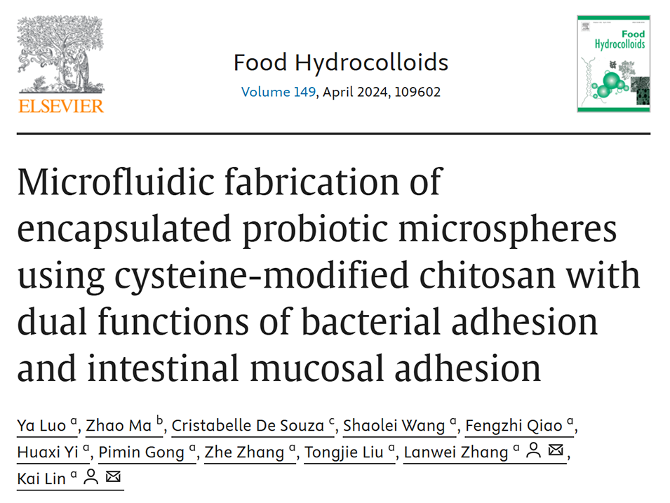 近期,中国海洋大学张兰威教授、林凯副教授等人将半胱氨酸的巯基引入壳聚糖,采用微流控技术制备了单分散性巯基改性壳聚糖微球,通过细菌表面和黏液层的半胱氨酸残基之间的巯基/二硫键交换反应,实现了益生菌粘附和黏液粘附的双重功能。相关研究以“Microfluidic fabrication of encapsulated probiotic microspheres using cysteine-modified chitosan with dual functions of bacterial adhesion and intestinal mucosal adhesion”为题目,发表在期刊《Food Hydrocolloids》上。