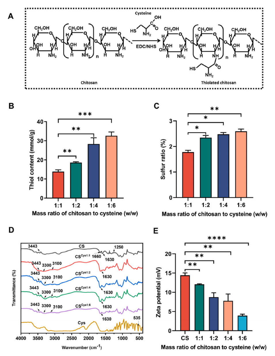 1、巯基引入与二硫键形成:通过在壳聚糖上引入巯基(-SH),这些巯基能够与肠道粘液中的富含半胱氨酸的糖蛋白亚基进行巯基-二硫键交换反应,形成稳定的共价键连接。这种化学结合显著增强了益生菌与肠黏膜的粘附能力。