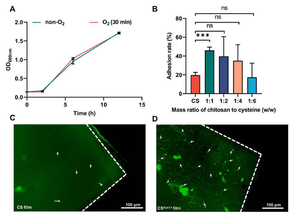 2、双重粘附功能:半胱氨酸修饰的壳聚糖不仅能与肠道粘液中的半胱氨酸残基结合,还能与益生菌表面的半胱氨酸残基结合,从而实现益生菌的双重粘附功能。这种双重粘附机制提高了益生菌在肠道中的定植能力。