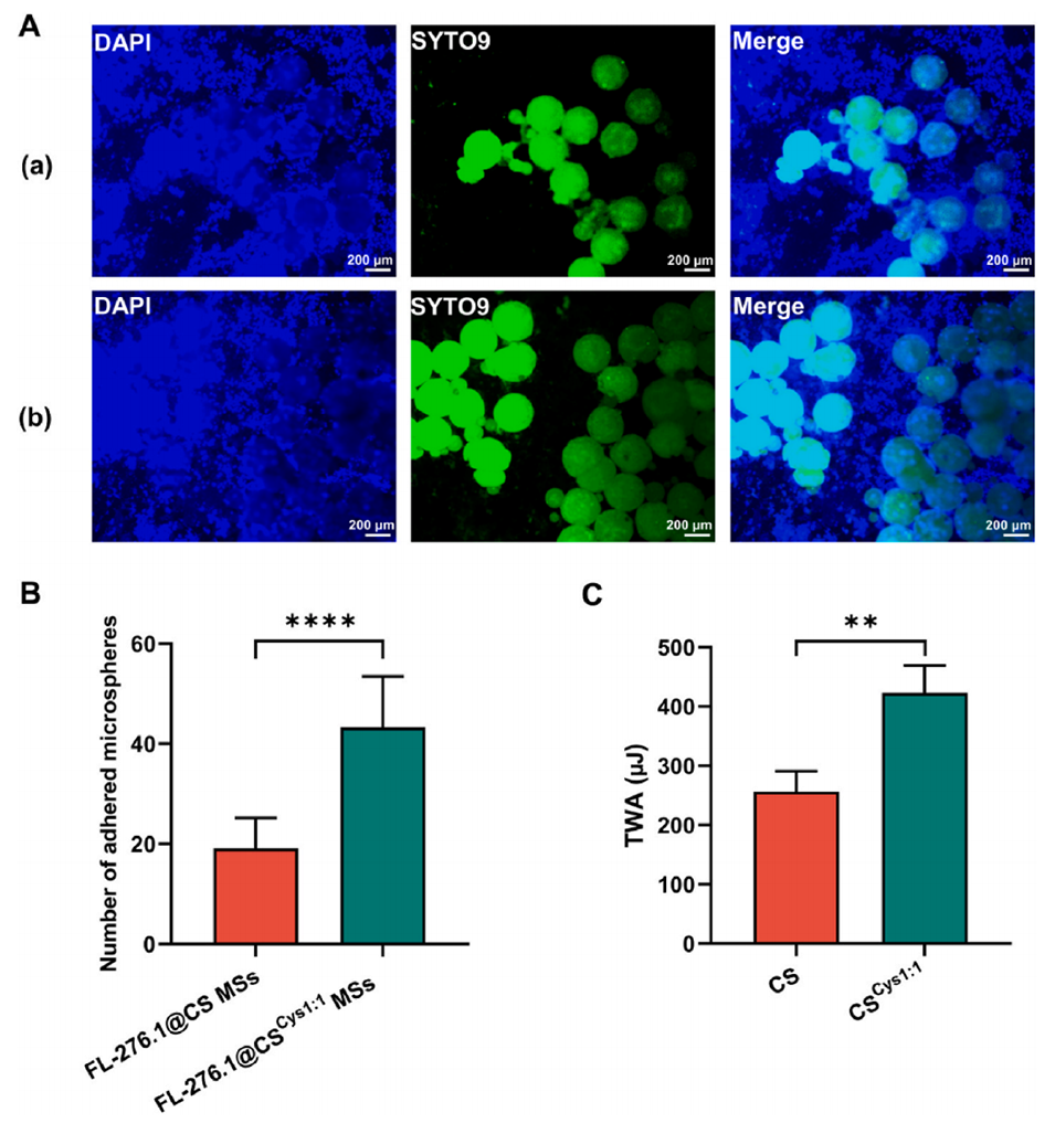 图5.FL-276.1@CS MSs和FL-276.1@CSCys1:1 MSs对人结肠细胞系HT-29细胞和猪大肠组织的体外粘附试验。