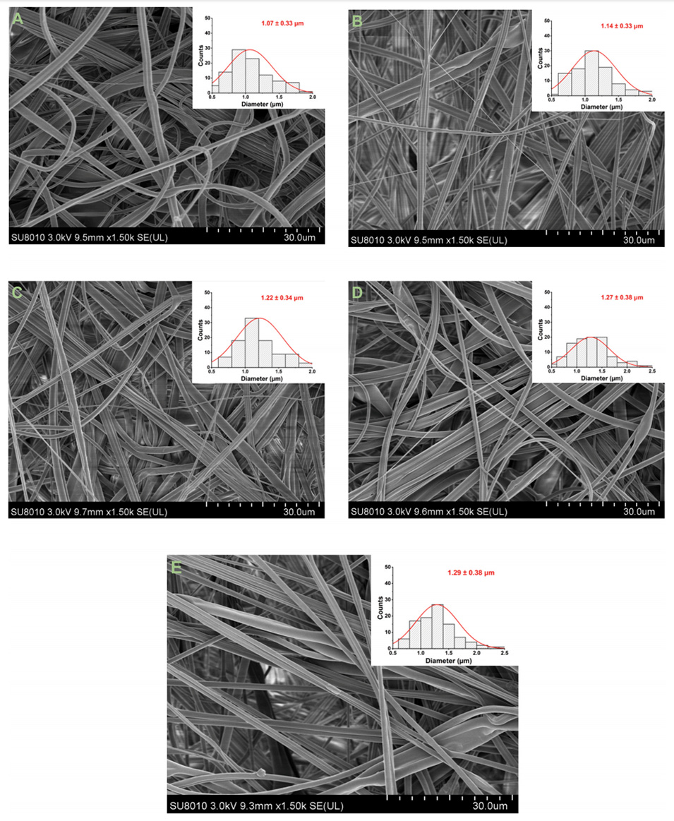图1.纤维薄膜的SEM图像:(A)Nata 0;(B)Nata 0.02;(C)Nata 0.04;(D)Nata 0.1;(E)Nata 0.2。根据纺丝溶液中纳他霉素的量,将获得的纤维膜分别命名为Nata 0、Nata 0.02、Nata 0.04、Nata 0.1和Nata 0.2。例如,将由含0.02g纳他霉素的纺丝溶液获得的纤维膜命名为Nata 0.02。