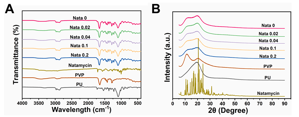 图2.薄膜、PU、PVP和纳他霉素的FTIR光谱(A)和XRD图谱(B)。