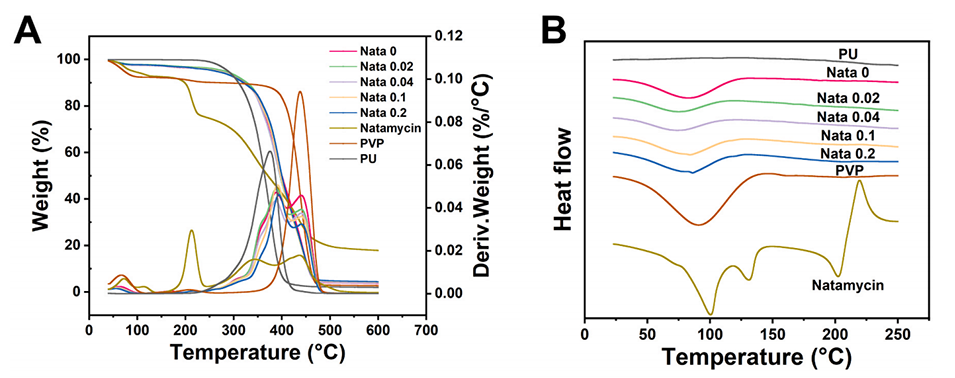 图3.所开发薄膜、PU、PVP和纳他霉素的TGA曲线(A)和DSC曲线(B)。