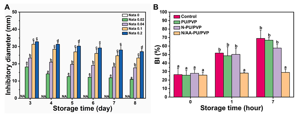 图4.(A)所开发的薄膜对灰霉病菌的抑菌圈直径;(B)不同组别鲜切苹果的褐变指数(BI)。