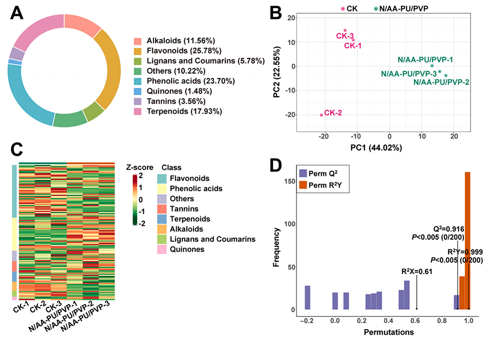 图5.(A)已鉴定代谢物类别的环形图、(B)PCA图、(C)聚类热图和(D)OPLS-DA验证。