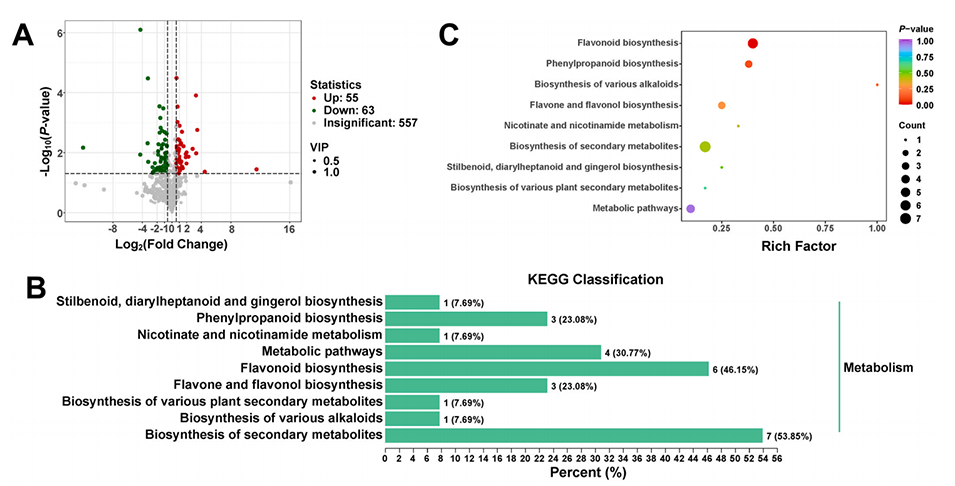 图6.(A)差异代谢物的火山图,(B)KEGG分类,(C)KEGG富集图。
