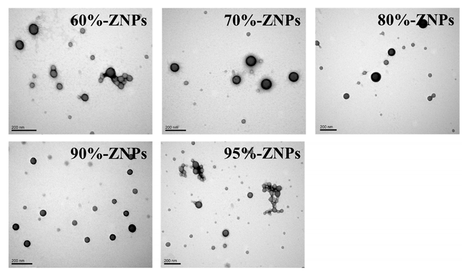 图3.微流体技术生产的ZNPs的TEM图像,内相为60%、70%、80%、90%和95%乙醇水溶液。