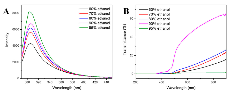 图1.溶于60%、70%、80%、90%和95%乙醇水溶液内相中的玉米醇溶蛋白的荧光光谱(A)和紫外光谱(B)。