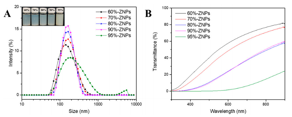 图4.微流体技术生产的ZNPs的粒径分布(A)和透光率(B),内相为60%、70%、80%、90%和95%乙醇水溶液。