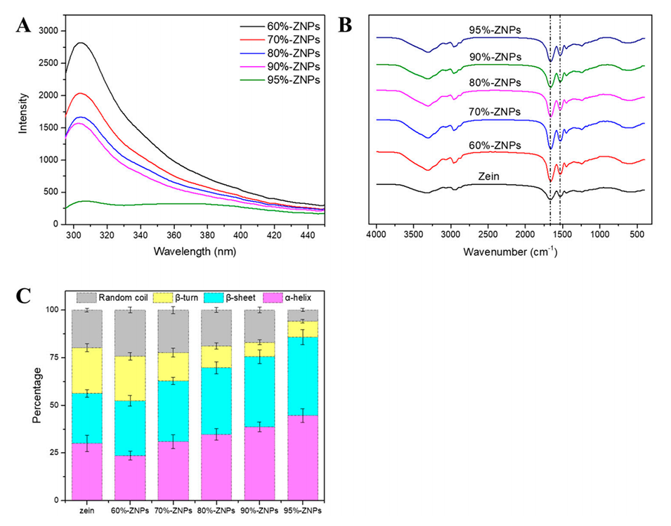 图5.微流体技术生产的ZNPs的荧光光谱(A)、FTIR(B)和二级结构组成(C),内相为60%、70%、80%、90%和95%乙醇水溶液。