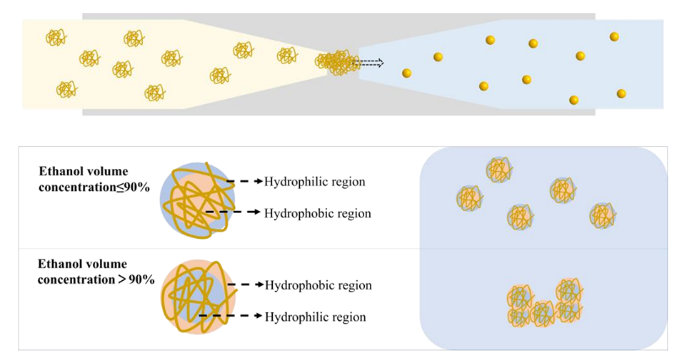 图6.微流体技术生产ZNPs的形成机理示意图,内相为60~95%乙醇水溶液。