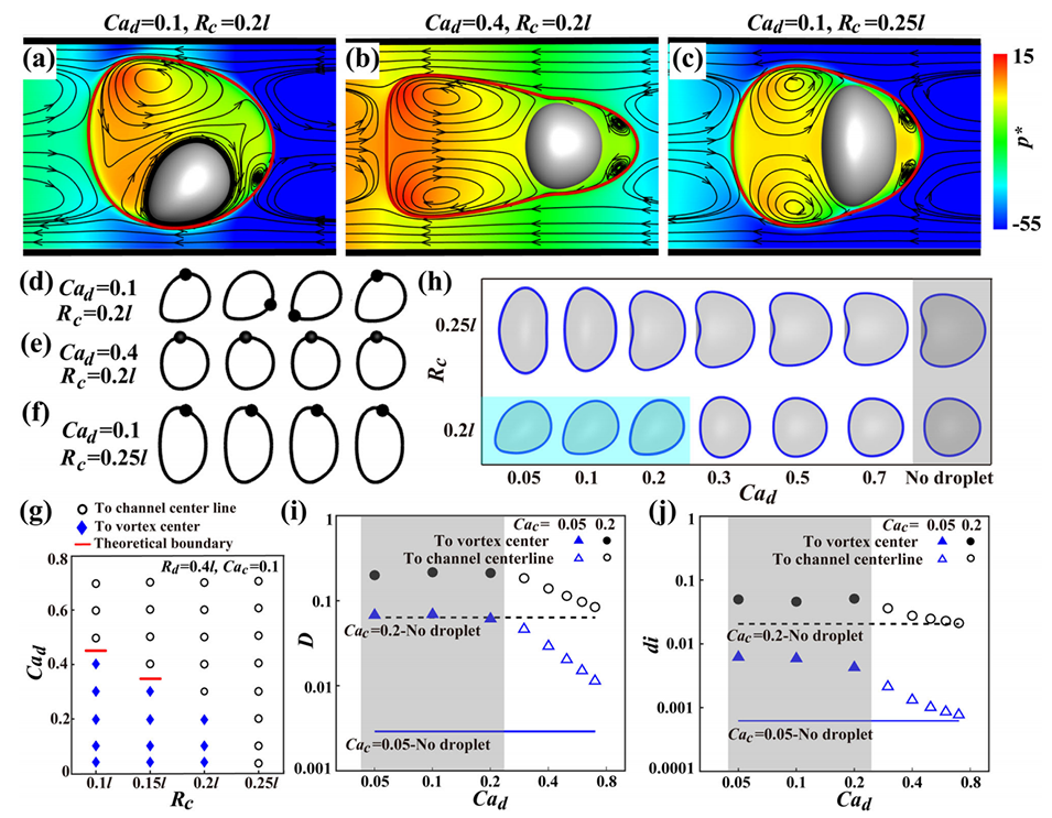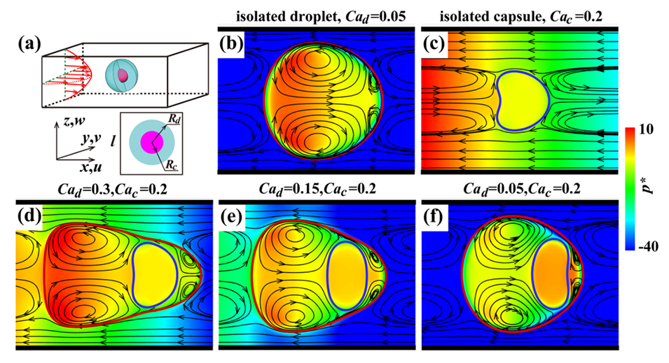 图1.通道流中单独液滴、单独胶囊和封闭在液滴中的胶囊的稳定形状和周围流场。