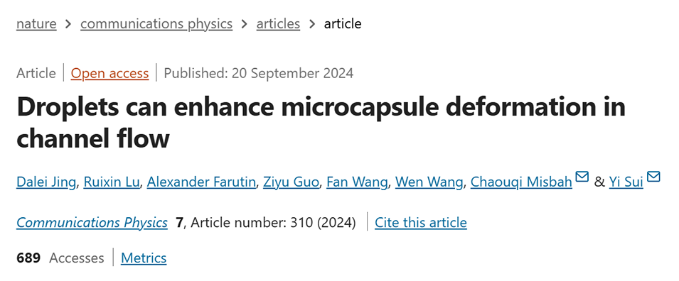 近期,格勒诺布尔阿尔卑斯大学的Dr. Chaouqi Misbah与伦敦玛丽皇后大学的Pro. Yi Sui合作,探究了在微通道中流动的液滴包裹软微粒的变形动力学,发现液滴能显著增强软微粒的变形,并提出了预测微囊变形的理论模型。相关研究以“Droplets can enhance microcapsule deformation in channel flow”为题目发表于期刊《Communications Physics》。