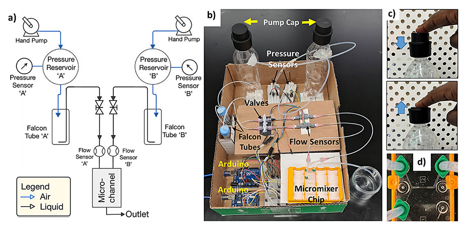 图1.(a)NP合成平台示意图,显示了平台的不同组件及其连接方式。(b)实际泵送平台的照片,显示了两个带有泵盖的汽水瓶、压力和流量传感器以及微型混合器芯片。泵送平台尺寸为40cm×30cm。(c)特写显示手指操作的泵盖,(d)用于脂质体制备的人字形微混合器芯片的特写显示左侧的缓冲液和脂质溶液入口以及右侧的NP收集出口。