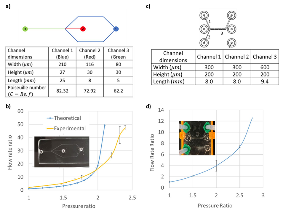 图4.(a)用于制备纳米颗粒的典型流体动力学流动聚焦装置示意图。端口1是缓冲液入口,端口2是脂质/聚合物入口,端口3是出口。下表显示了(a)中器件的不同微通道的尺寸。泊肃叶数是层流下微通道内雷诺数乘以达西摩擦系数的乘积,与通道纵横比存在函数关系。(b)(a)中描述的流体动力聚焦芯片的实验和理论流量比与压力比,如插图所示。(c)用于制备脂质体的人字形微混合器的示意图和尺寸。(d)人字形微混合器芯片中的实验流速比(插图)。由于通道内的人字形微混合器脊干扰了通道内的流动,导致与理论计算存在较大偏差,因此没有绘制该芯片的理论数据。误差条表示一个标准偏差