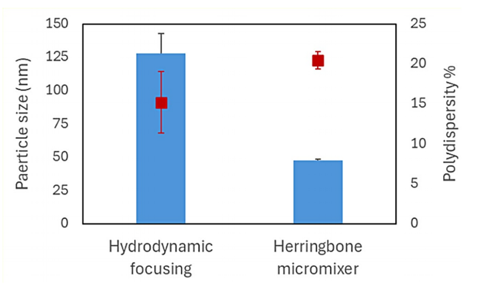 图6.使用手指操作的泵送平台,在流体动力学流动聚焦装置和人字形微混合器内制备PLGA纳米粒子。条形图表示粒径,标记表示多分散性。流体动力学聚焦装置在PR为1.2时运行,对应于FRR为4:1(去离子水:DMF),而人字形微混合器在PR=2时运行,对应于FRR=5:1(PBS:脂质)。所有数据点均一式三份。误差条表示一个标准偏差。