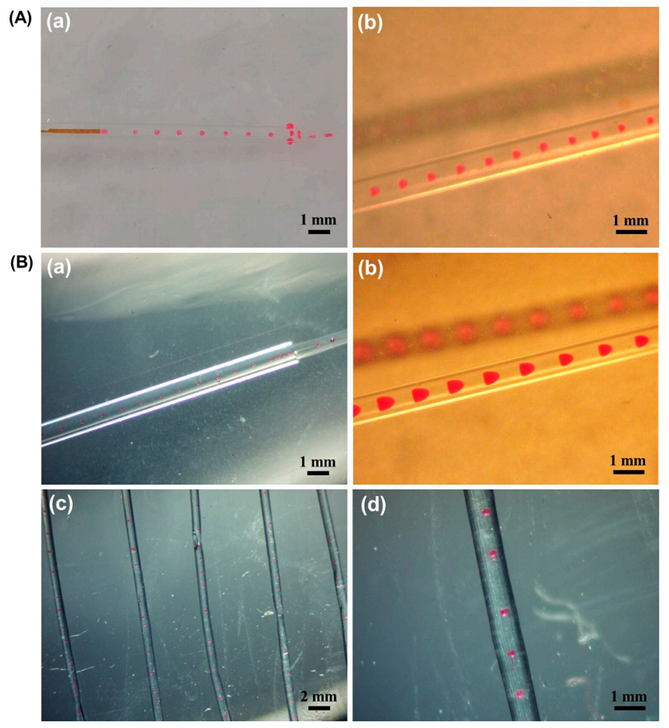图1.(A)O/W液滴(a)和毛细管中液滴的形成(b)。(B)PLGA液滴(a,b)和PLGA微球@海藻酸钙纤维的形成(c,d)。