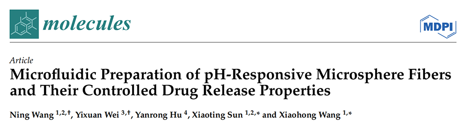 近期,中国医科大学孙小婷、王小红等人利用共轴毛细管微流控装置制备了包裹pH敏感聚合物微球的海藻酸盐水凝胶纤维,通过调节流速可控制微球尺寸和间距,并利用pH响应性聚合物和羧甲基纤维素赋予纤维选择性药物释放功能,为开发智能手术敷料提供了新思路。相关研究以“Microfluidic Preparation of pH-Responsive Microsphere Fibers and Their Controlled Drug Release Properties”为题目,发表在期刊《Molecules》上。