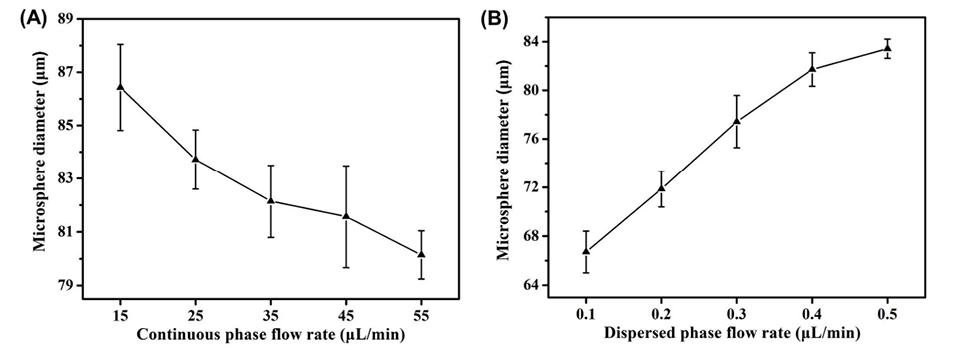 图3.连续相流速(A)和分散相流速(B)对微球尺寸的影响。