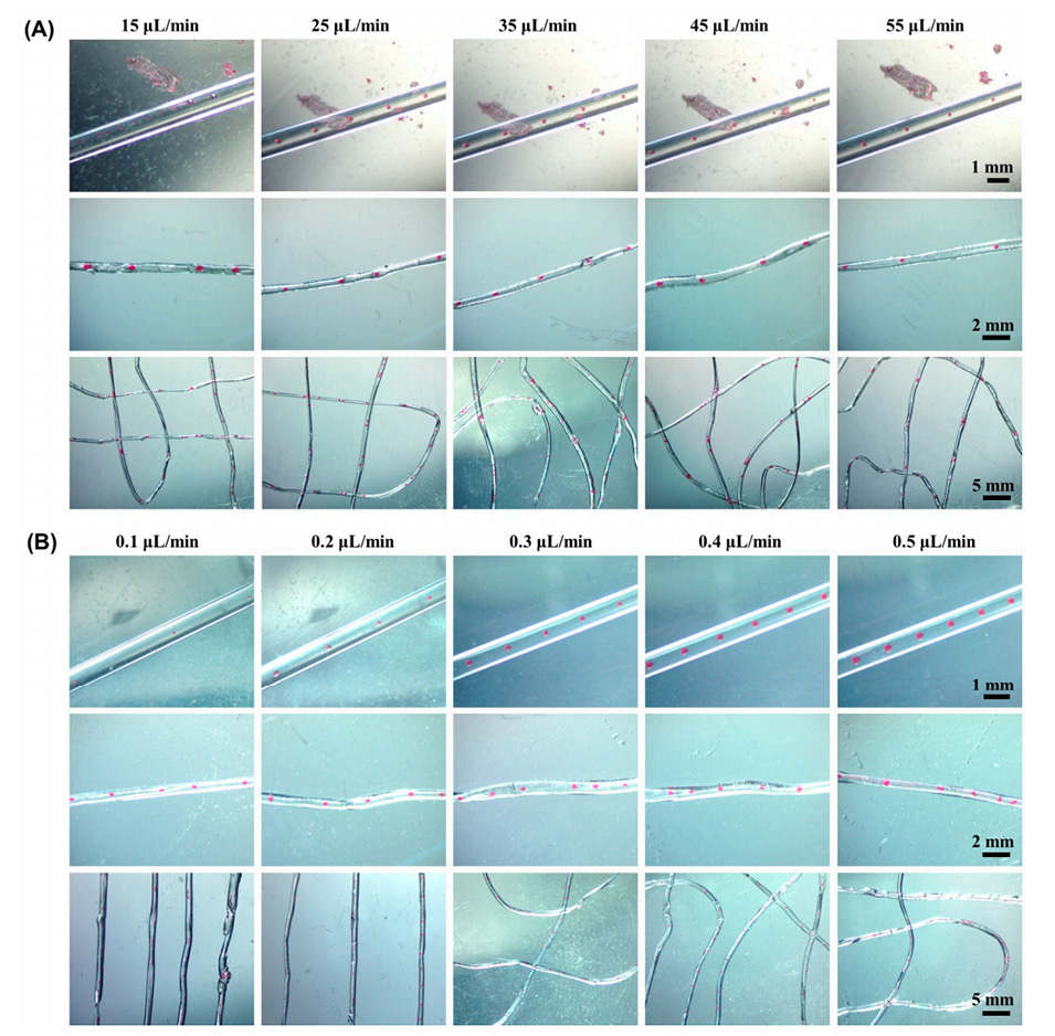 图2.不同连续相(A)和分散相(B)流速下的液滴和微球藻酸盐纤维。