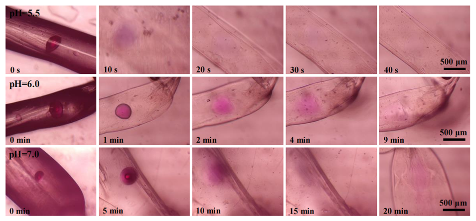 图5.在pH=5.5、pH=6.0和pH=7.0条件下的p(BMA-co-DAMA-co-MMA)微球@CMC掺杂海藻酸钙纤维。