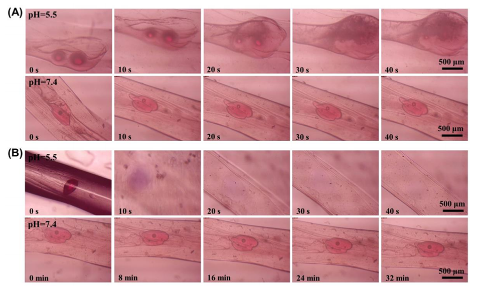 图4.在不同pH值(pH=5.5和pH=7.4)下的p(BMA-co-DAMA-co-MMA)微球@海藻酸钙纤维(A)和p(BMA-co-DAMA-co-MMA)微球@CMC掺杂海藻酸钙纤维(B)。