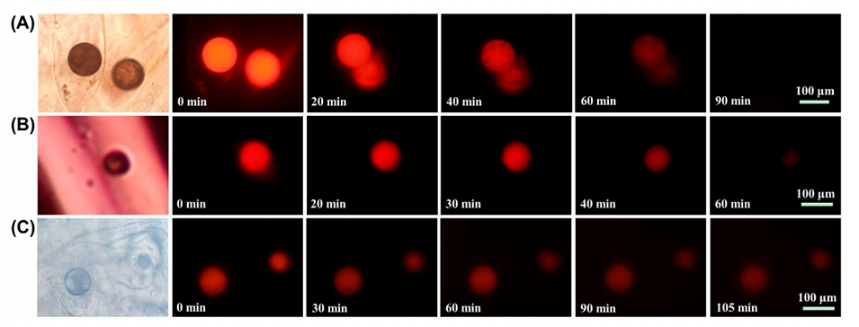 3、通过羧甲基纤维素(CMC)改性,海藻酸盐水凝胶表现出增强的pH敏感性(在酸性条件下收缩,在碱性条件下膨胀),进而影响内层微球释放分子的扩散速率。