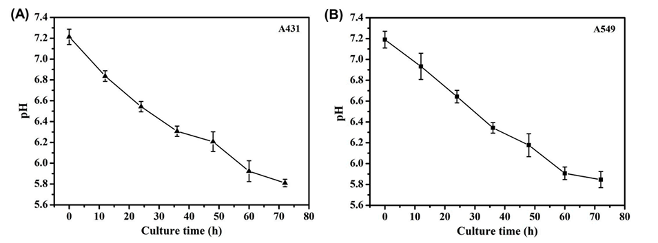 图6.A431细胞(A)和A549细胞(B)的pH值随培养时间的变化。