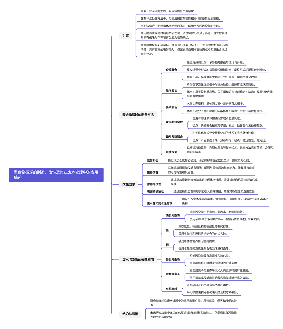 3、详细阐述了聚合物微球在废水处理中的应用,包括去除氮、磷、重金属、有机染料等污染物,并分析了其吸附性能和机理。