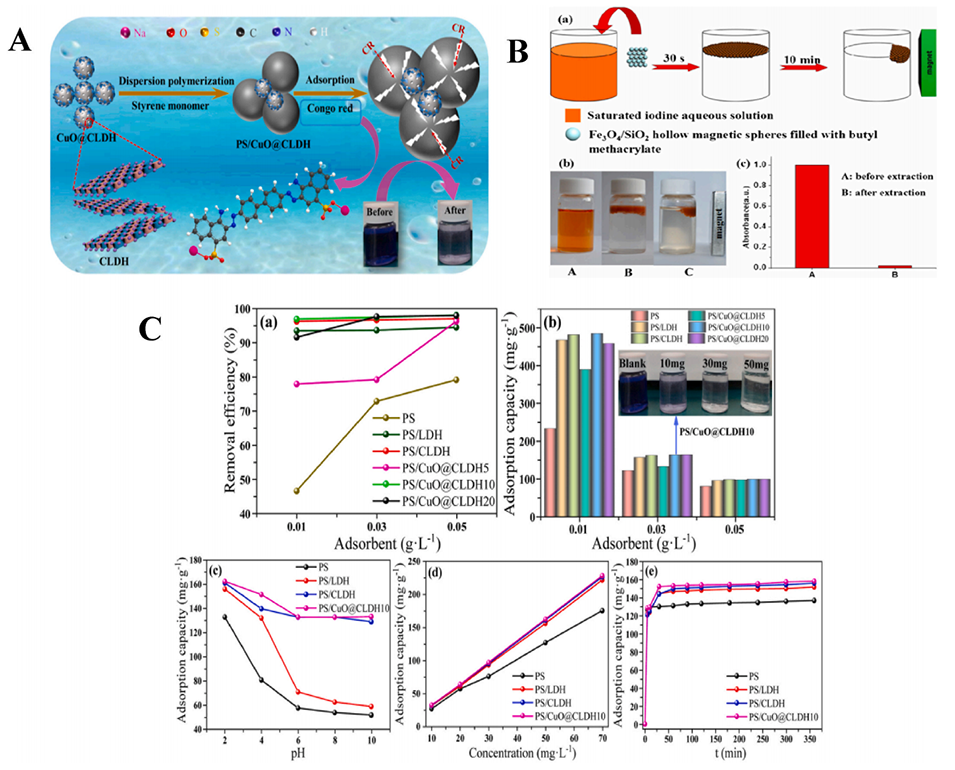 图2.(A)PS/CuO@CLDH微球形成过程示意图。(B)Fe3O4 NPs/SiO2核壳空心微球在解毒提取和快速废物去除中的应用:a提取和去除过程的示意图;b分别为提取前(A)、提取后(B)和外部磁力去除后(C)的碘溶液照片;c添加微球前后在365nm处收集的碘水溶液的紫外吸收。(C)复合材料的吸附性能:吸附剂对(a)去除效率、(b)吸附容量、(C)pH值、(d)初始浓度和(e)接触时间的影响。