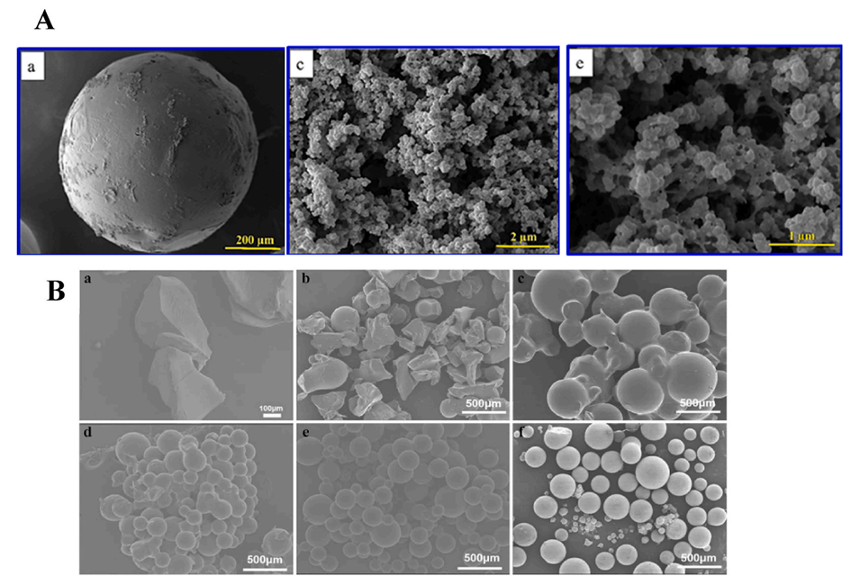 图4.(A)(a)IIP珠的SEM图像,(b-c)IIP的低倍和高倍放大。(B)不同SiO2含量下高吸水性聚合物的SEM:a,溶液聚合制备SAP;b-f,SiO2含量为0%、0.5%、1.0%、1.5%、2.0%下的改性悬浮聚合。