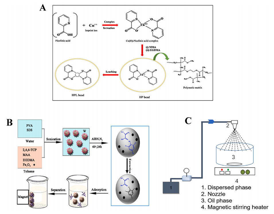 图3.(A)IIP制备示意图。(B)悬浮聚合制备磁性分子印迹聚合物的路线示意图。(C)改性悬浮聚合装置示意图。