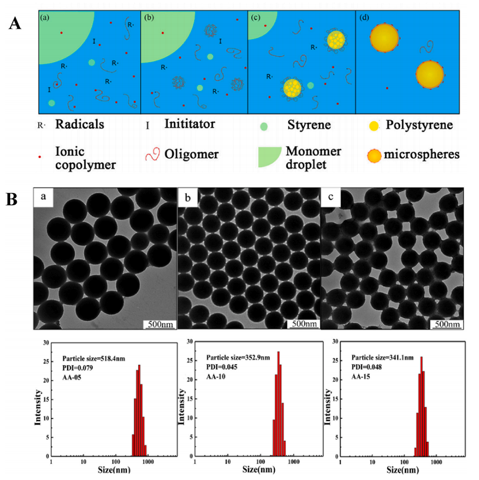 图7.(A)亲水共聚单体存在下超临界流体萃取机理的简化示意图。(B)不同AA含量的P(St-co-AA)共聚物的图像及其相应的直方图。(a)5mol%AA,(b)10mol%AA和(c)15mol%AA。
