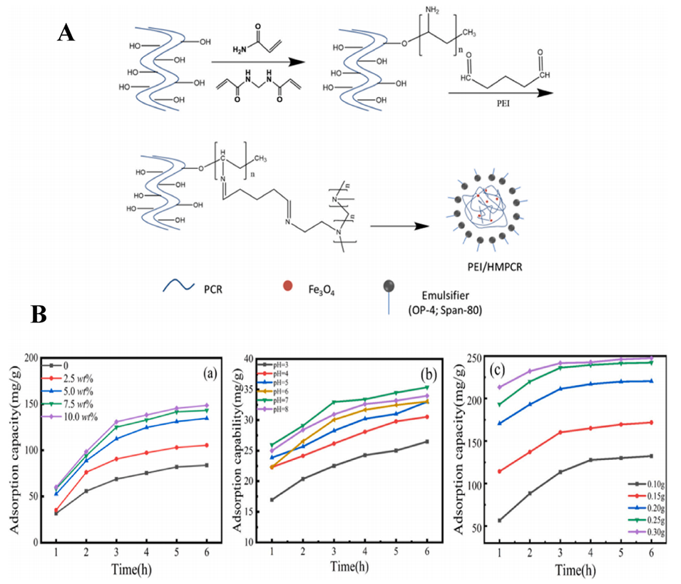 图9.(A)PEI/HMPCR合成示意图。(B)PEI量(a)(25℃,pH=7,初始浓度250mg/L,PEG2000量为20.0wt%)、溶液pH值(b)(25℃,PEI量为5.0wt%,初始浓度为50mg/L,PEG2000量为20.0wt%),以及PEI/HMPCR吸附剂量(c)(25℃,PEI量为5.0wt%,pH=7,初始浓度为250mg/L,PEG2000量为20.0wt%)对Cd(II)吸附容量的影响。