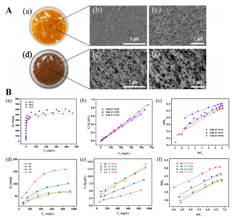 图10.(A)CSFe(a)和CS-Fe@PEI(d)的照片。CS-Fe(b,c)和CS-Fe@PEI(e,f)的SEM图像。(B)CS-Fe@PEI在298、308和318K下对Cr(VI)的吸附等温线(a)、Langmuir等温线(b)和Freundlich等温线(c)。CS-Fe@PEI在298K(d)下对Cu(T)、Cd(II)、Ni(I)和Pb(II)的吸附等温线、Langmuir等温线(e)和Freundlich等温线(f)。