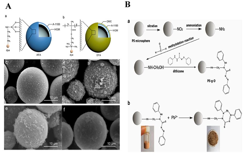 图12.(A)AFA(a)和DFA(b)表面物质的结构图和化学式;HGM(c)、PHGM(d)、AFA(e)和DFA(f)的SEM图像。(B)双硫腙接枝聚苯乙烯微球的制备与吸附,(a)合成路线,(B)Pb2+螯合。
