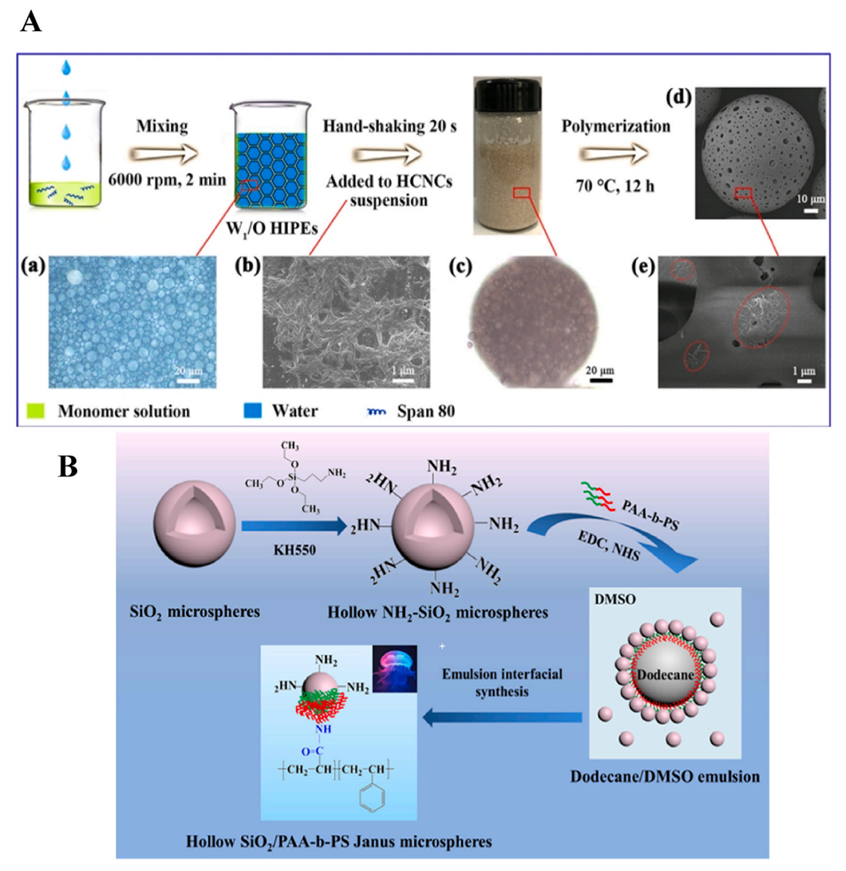 图13.(A)HPHs合成过程示意图。(a)原始W1的光学显微照片,W1/O/W2/O HIPE(水染成蓝色)的光学显微图。(b)HCNCs的SEM图像。(c)双重Pickering乳液(内部水相染成红色)。(d-e)HPHs的SEM图像,(e)中的圆圈显示了嵌入HPHs表面的HCNCs。(B)空心SiO2/PAA-b-PS Janus微球的制备示意图。