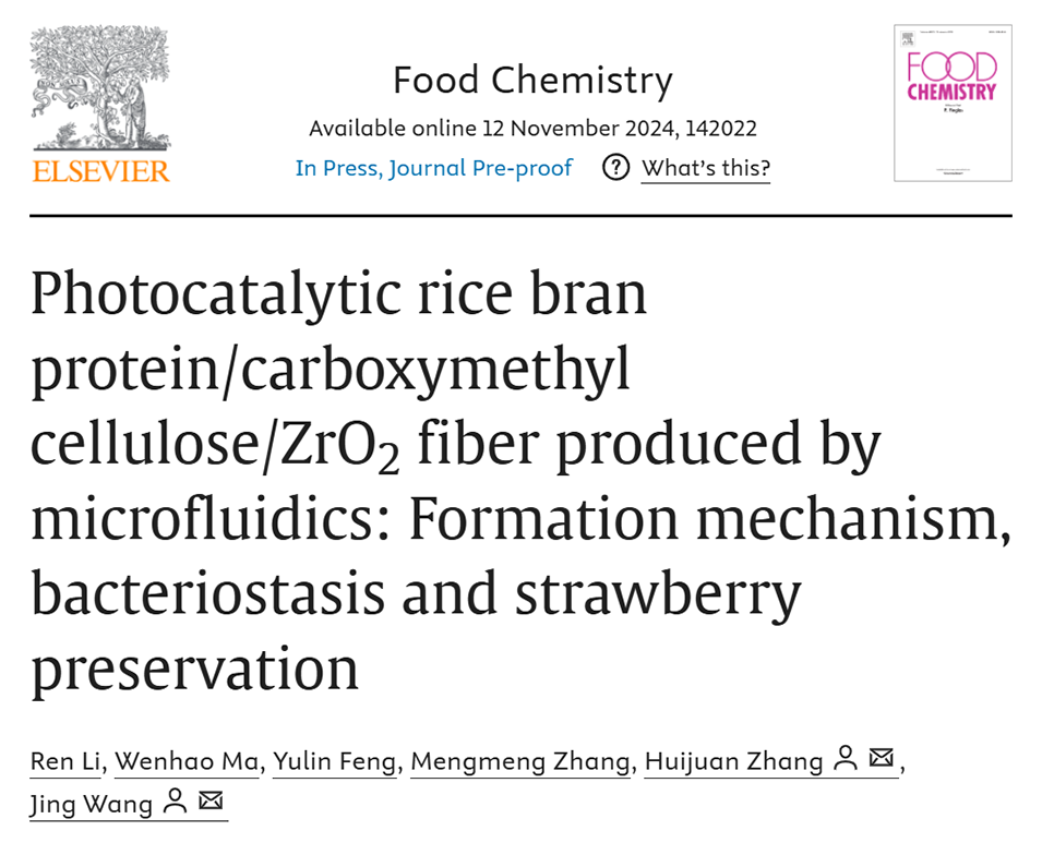 开发具有成本效益且环保的活性包装材料仍然是一项重要挑战。近期,北京工商大学食品学院王静教授、张慧娟教授等人采用微流控纺丝技术制备了米糠蛋白(RBP)/羧甲基纤维素(CMC)/ZrO2纤维。探讨了纤维的形成机制,通过光催化实验验证了其抗菌性能,并考察了其对草莓保鲜的影响。相关研究以“Photocatalytic rice bran protein/carboxymethyl cellulose/ZrO2 fiber produced by microfluidics: Formation mechanism, bacteriostasis and strawberry preservation”为题目,发表在期刊《Food Chemistry》上。